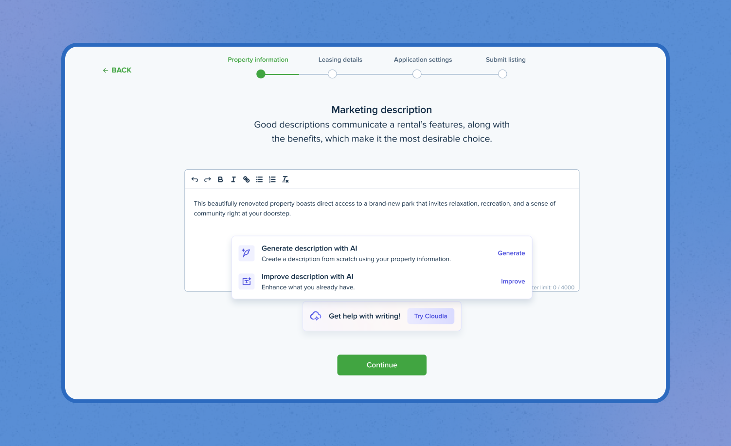 Cloudia entered the chat to create polished and engaging listing descriptions in seconds. With one click, users can generate descriptions that match property details, highlight amenities, and stand out on listing sites—no creative writing skills required.