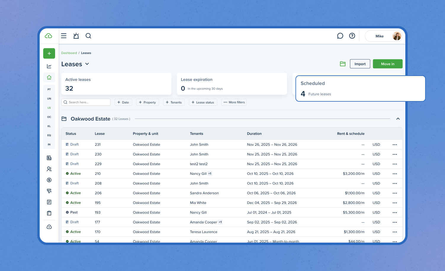 The new leases list makes it easy to view and manage all leases in one place. This view provides key details—lease number, status, tenants, rent, and quick actions—while highlighting total, future, and soon-to-expire leases, allowing you to take timely action.