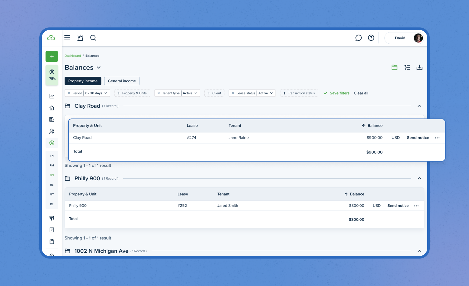 An updated balances page enables landlords to track tenant balances and property income more efficiently. With separate tabs for property and tenant-based income, totals for each property, transaction status filters, and streamlined CSV exports, keeping your finances organized has never been easier.