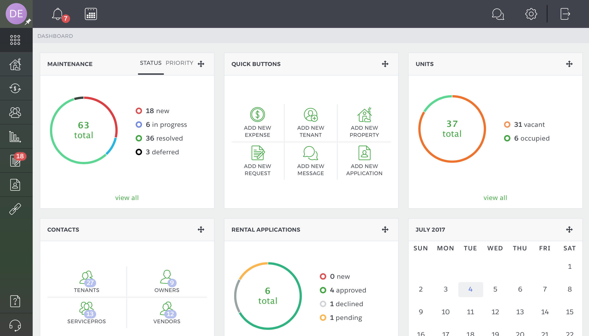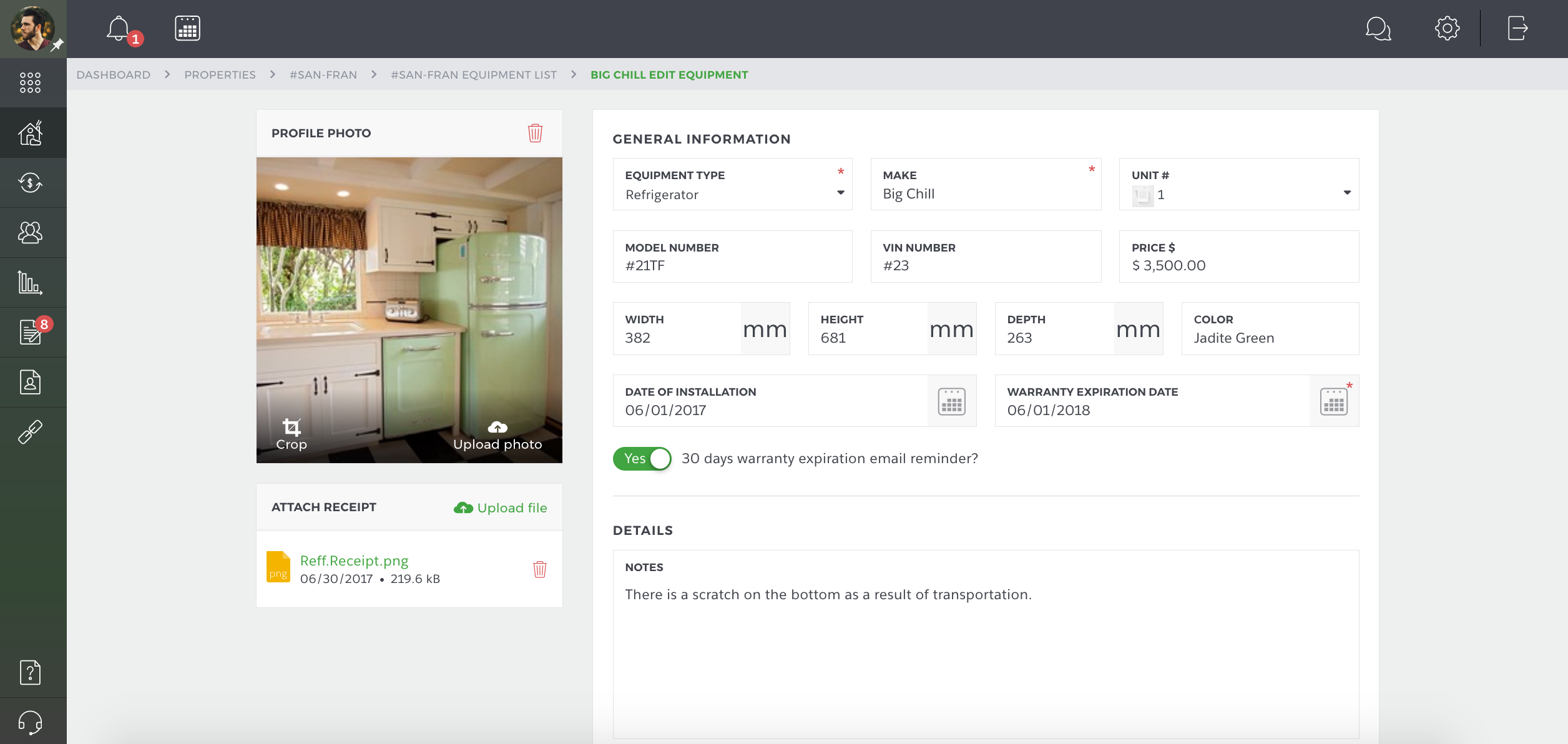 In the Property details, choose the Equipment tab and add all the necessary equipment pieces for each property unit. Smoke detector, hot water heater, refrigerator …….. everything is under control now. Fill in the make, model and vin numbers, size, color, dates of installation and warranty expiration, and upload a photo. Warranty expiration and maintenance due date reminders can be created automatically and visible in your Calendar. No more forgetting to take advantage of energy tax credits at the end of the year.