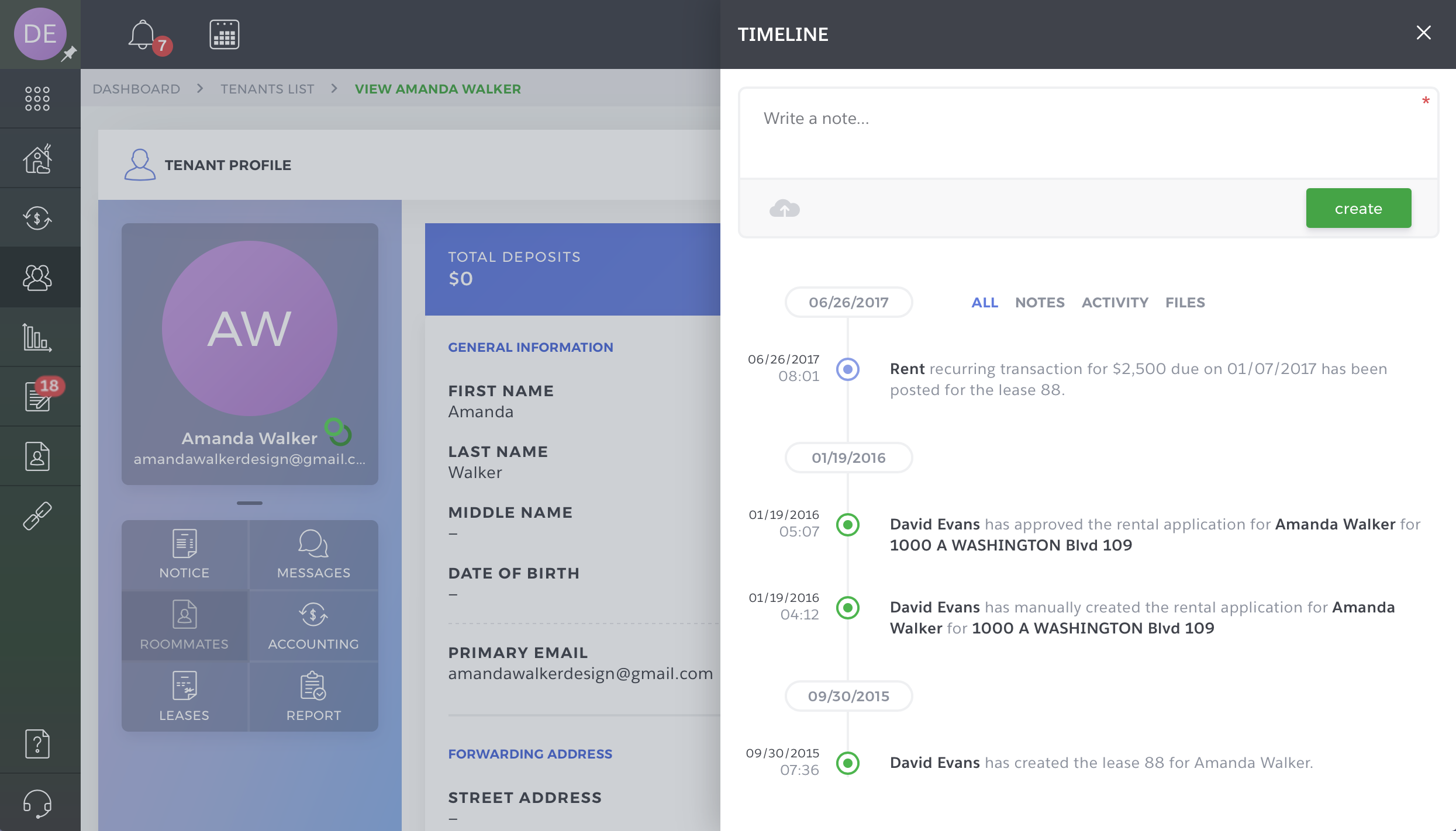To access the timeline, go to the tenant’s profile and press “Timeline” in the upper-right corner. Add notes right in the timeline.