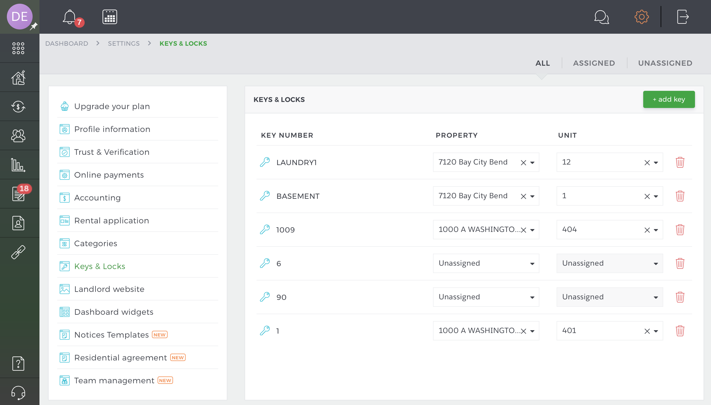 Keep track of all your keys with TenantCloud. Firstly, add them to your profile in the Keys and Locks section of the general settings menu by providing the key number (it can be any number or name, just make sure you have it tagged to the key in order not to mix them up). Then, assign them to properties and units when moving tenants in/out and reassign when needed. From now on, no need to buy new locks and keys!