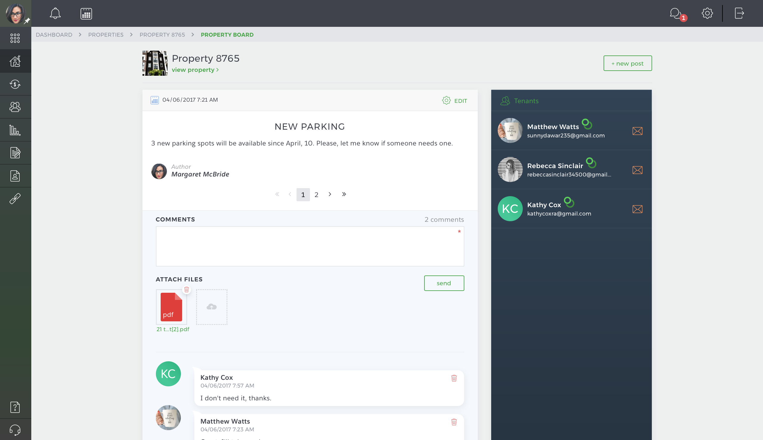 Property Message Board is a place where landlords and tenants can communicate and share files within the bounds of one property (available in Advanced and Premium payment plans only). This is a digital message board for tenants, so as to avoid publicly making notices that thieves or burglars might use. Using the Message board allows all tenants to share a place digitally.