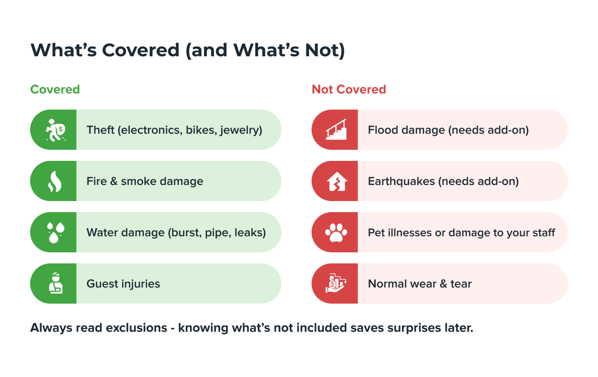 Renters insurance is all about protecting you and your stuff—inside the rental you're staying in. If your belongings are stolen or damaged by an accident like a kitchen fire or water leak, renters insurance can help you stay covered. It also includes liability protection in case someone gets injured in your home or you accidentally damage someone else’s property who has renters insurance. Some renter insurance policies even include medical coverage for injured guests or help with medical bills if a visitor is injured in your home.