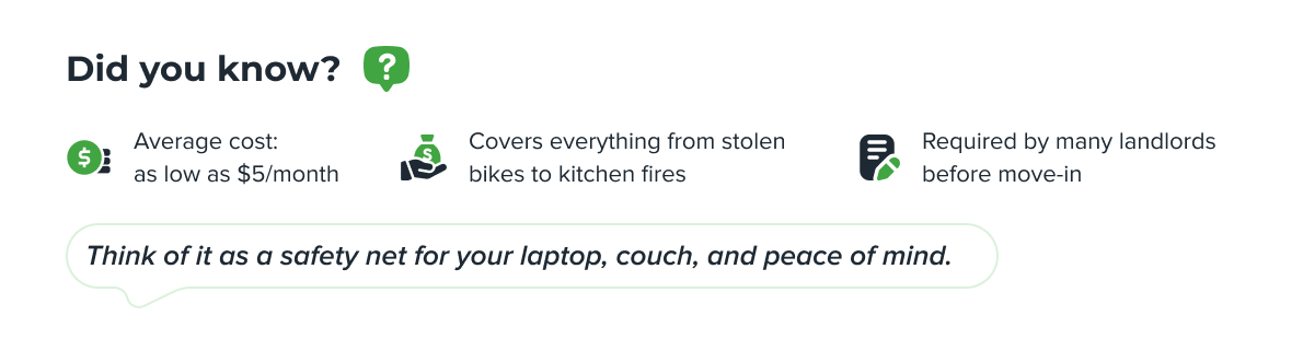 Think of renters insurance as a small investment for big peace of mind. From covering your laptop to helping with liability if a guest is injured, renters insurance has your back. It's an easy, affordable way to ensure that your belongings can be replaced in case an emergency happens.