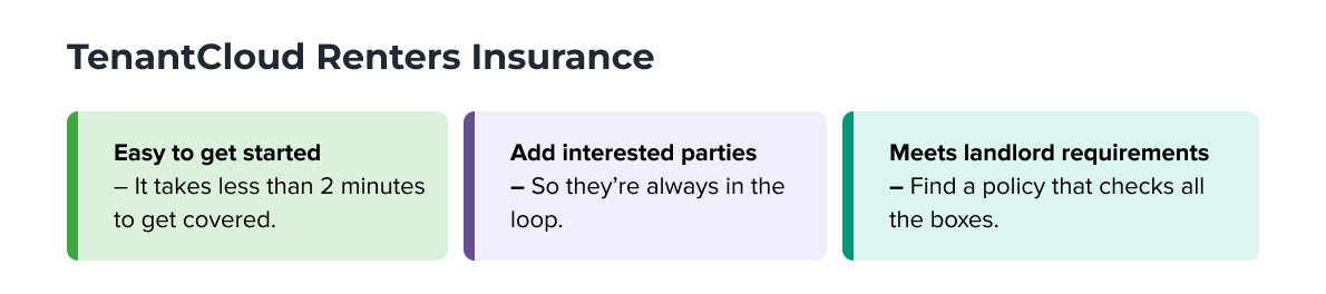 With TenantCloud Renters Insurance, you can quickly find insurance coverage that meets landlord requirements. You can even add your landlord or property manager as an interested party so they are included in the process. A good renters insurance should make it easy to keep an updated record of your belongings, review your policy regularly, and understand exclusions so you’re ready if life throws you a curveball.
