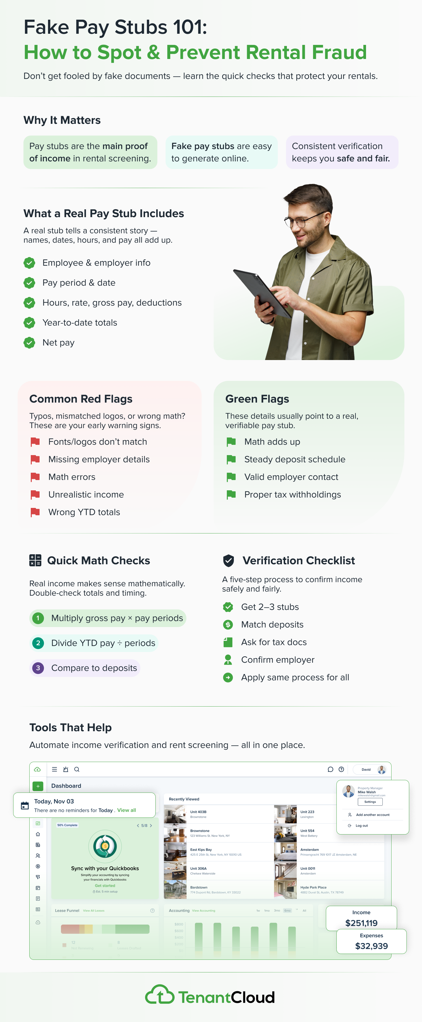 In this guide, we'll show you how to spot fake pay stubs and verify income details while keeping the landlord-tenant relationship trustworthy and safe. You’ll learn how to read an earnings statement, run the numbers for a pay period, verify bank statements and tax returns, and consolidate this information into a simple step-by-step process that you can follow each time.