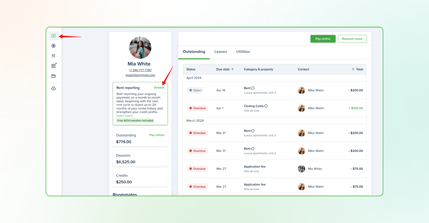 Locate the rent reporting tab by clicking the top link in the left sidebar. Then, click Enable underneath your name and email.