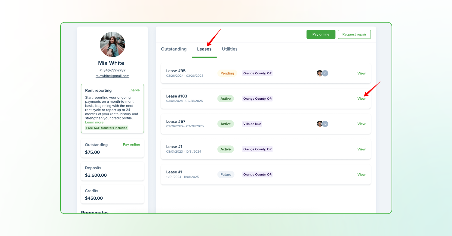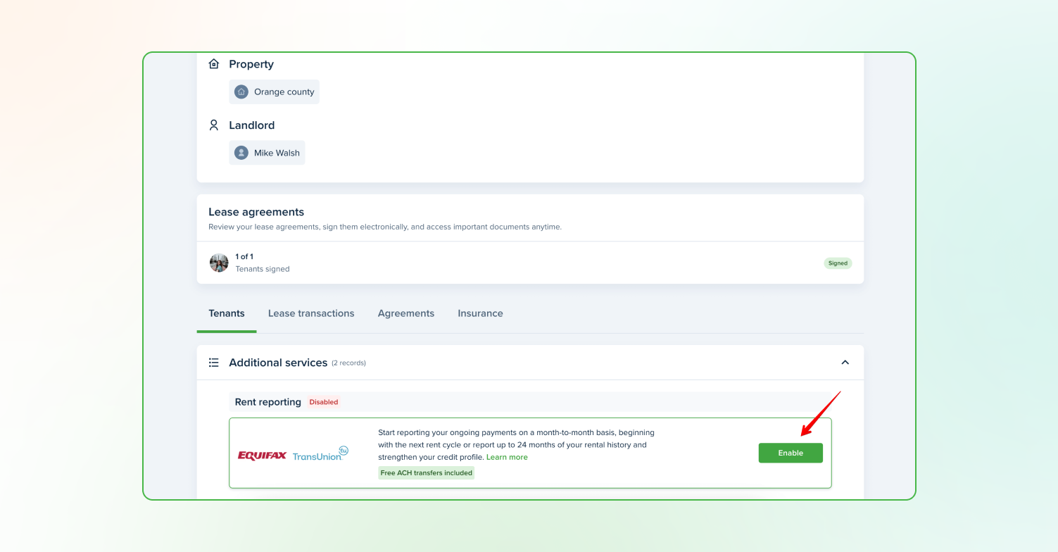 You can also find Rent Reporting on your Leases tab. Make sure you have the correct lease and click View, then scroll down to Additional services and press Enable.