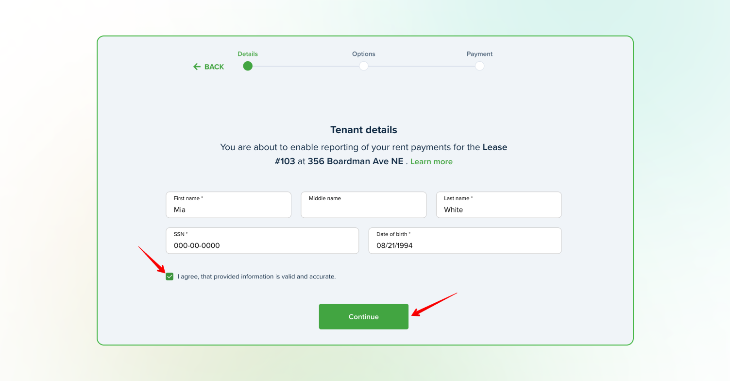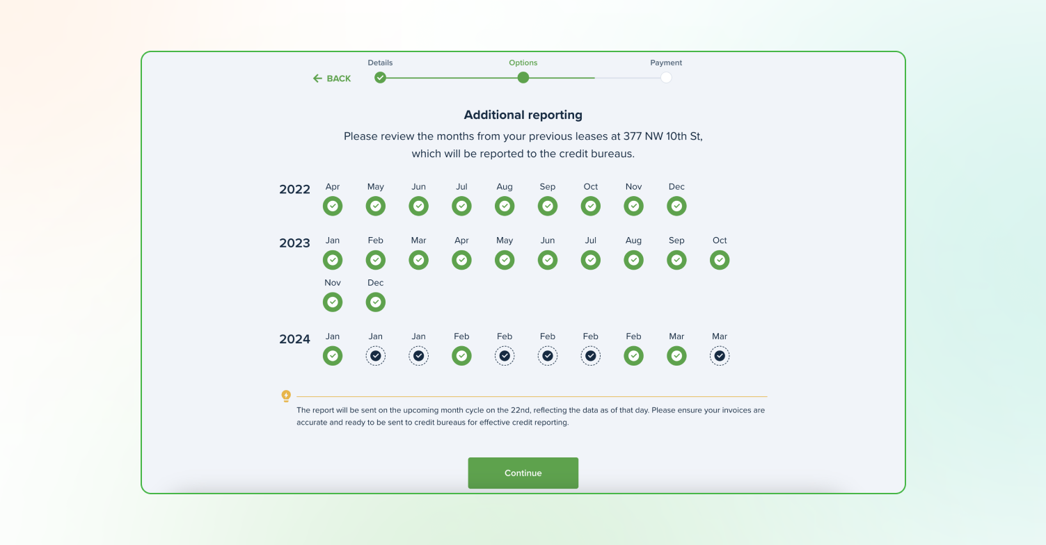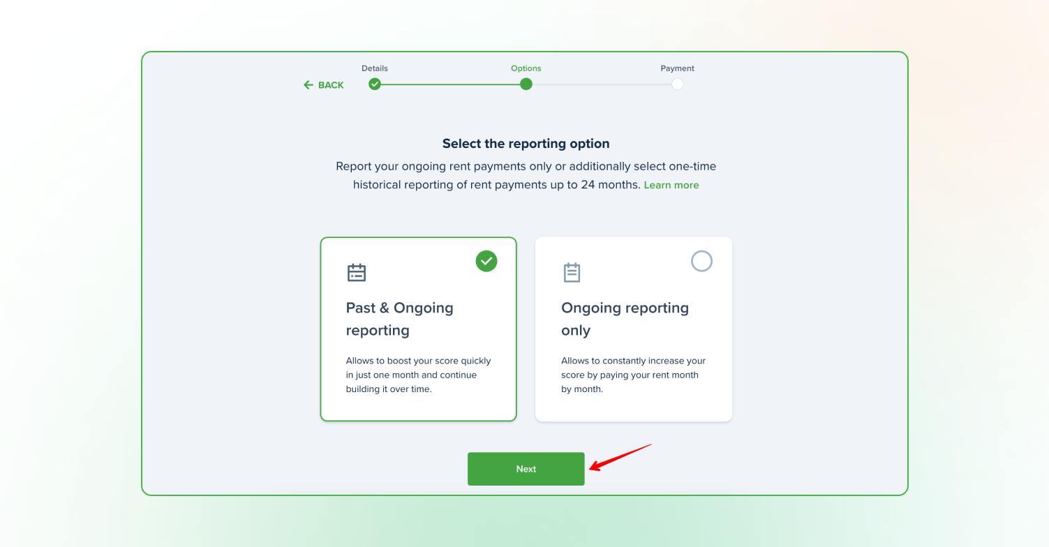 If you select Past + Ongoing Reporting, you’ll be able to review payments that will be reported. If you find any inaccuracies, please contact your landlord to adjust.