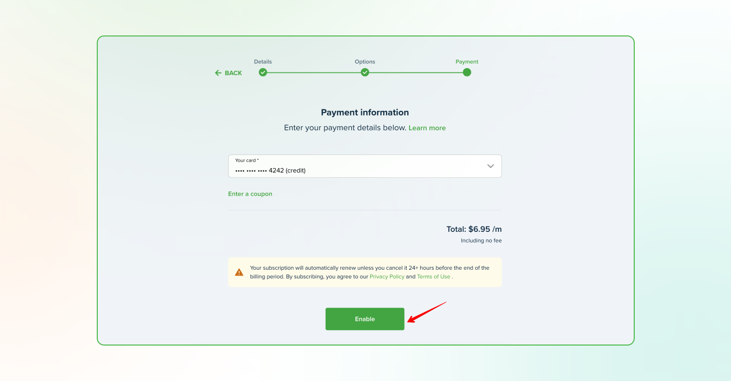 Next, enter your payment details and click Enable. That’s it! Reports are sent on the 22nd of each month. You’ll be notified one day before your first charge.