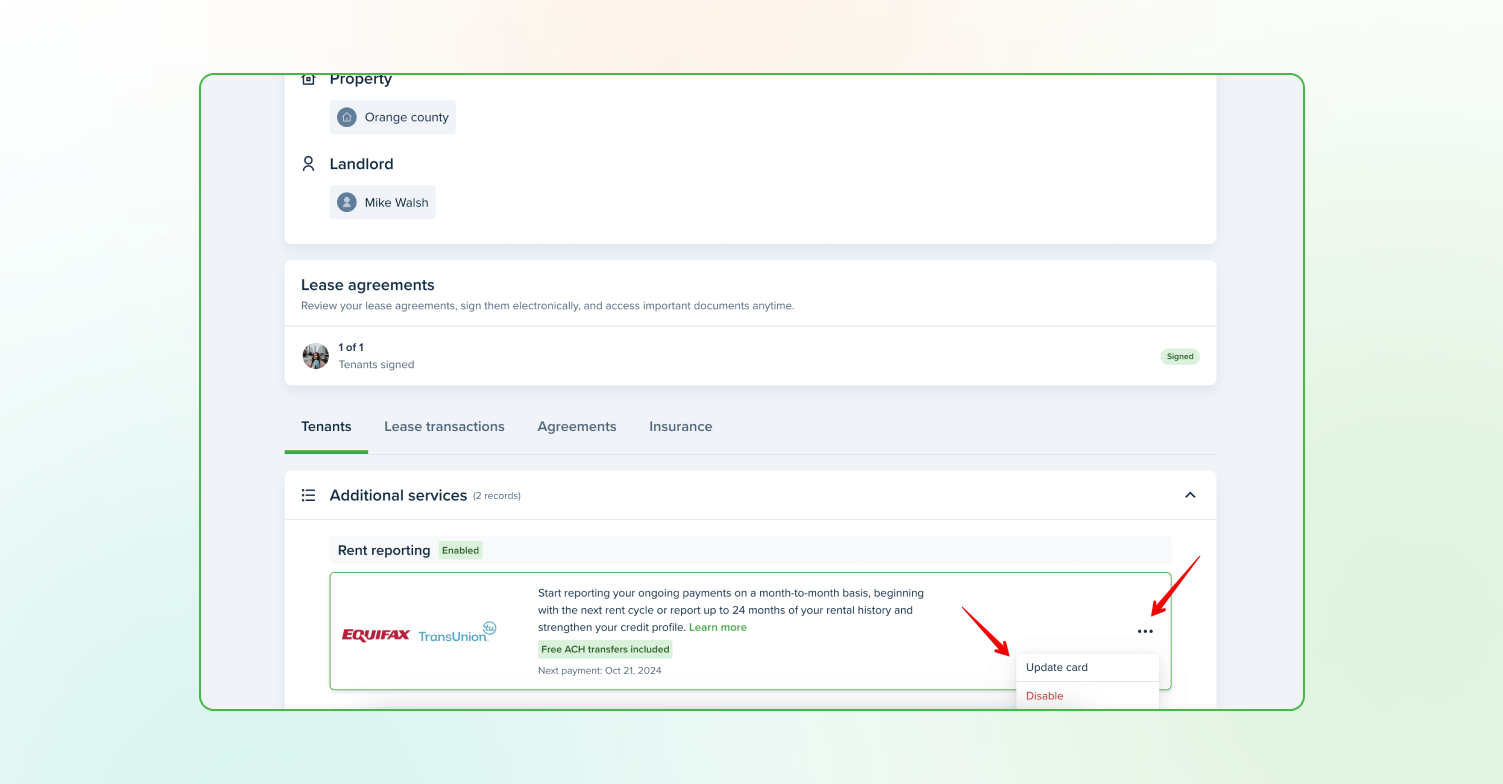 - Rent Reporting will automatically be disabled if the payment changes, the lease is deleted by the landlord, or the status becomes inactive or no longer monthly. If the account is deleted or reset, rent reporting will also be disabled.
