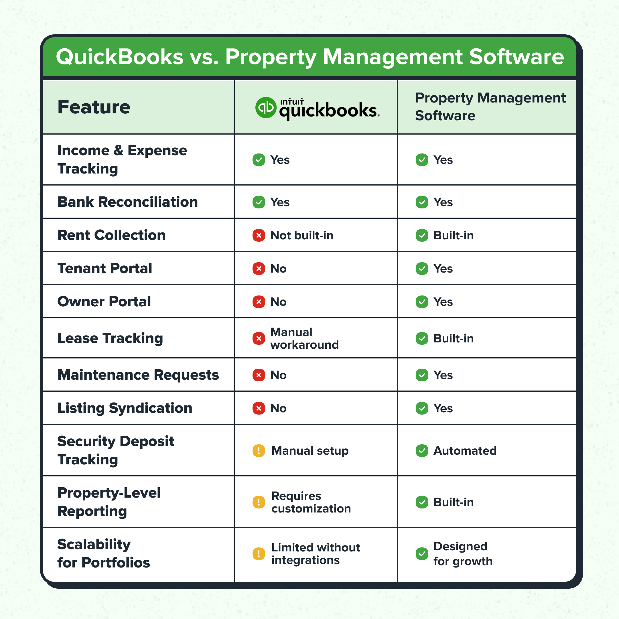 - Small landlords with a few units may find QuickBooks sufficient, but overall, growing portfolios, owner reporting, and operational efficiency typically require property management software.