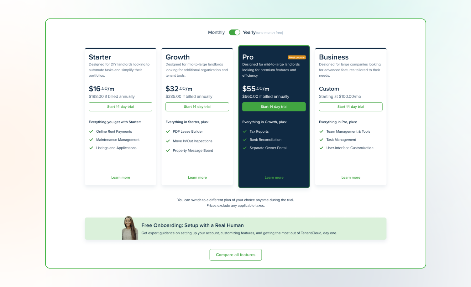 Consider the free plan or free tier options carefully. While attractive for budget-conscious landlords managing just a few properties, free plans often lack essential plan features like automated rent reminders or financial reports.