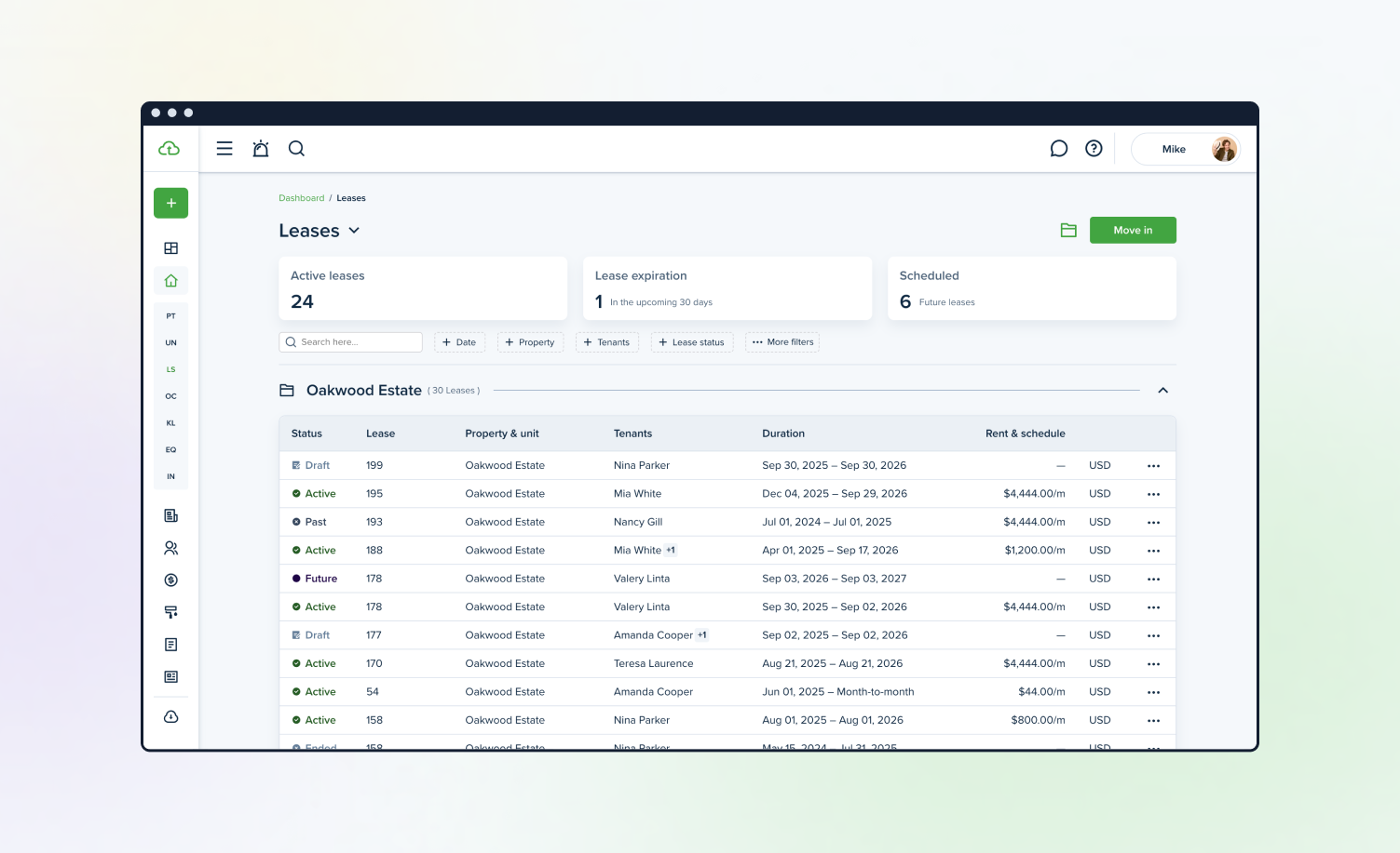 Switch between list view and the new timeline view (available starting with Pro plans) for the perspective that works best for you. Expiring leases are clearly marked, so you’ll never miss a renewal deadline.