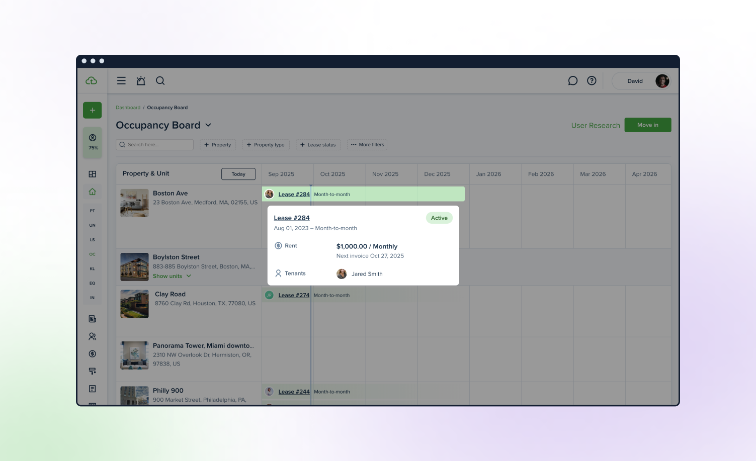 Meet the Occupancy Board - a visual board that makes it easy to see lease activity across all your properties. Track current, upcoming, and past occupancy, spot when units will become vacant, and take quick actions like renewing or creating leases directly from the board.