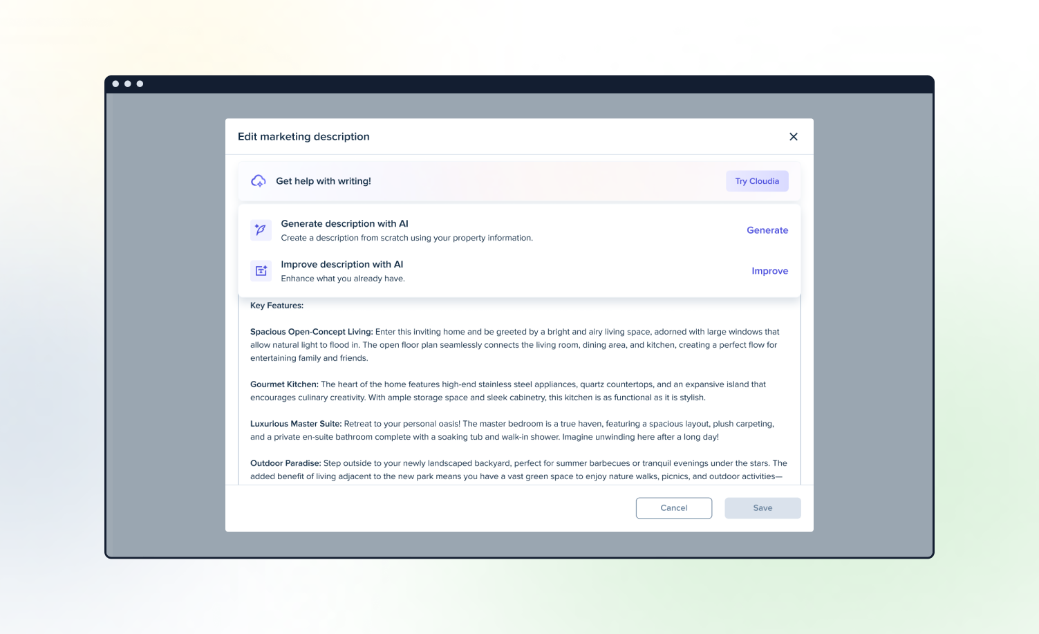 Creating rental listings just got smarter. Say hello to Cloudia, our new AI-powered tool that helps you instantly generate a polished, engaging listing description—or enhance the one you’ve already written.