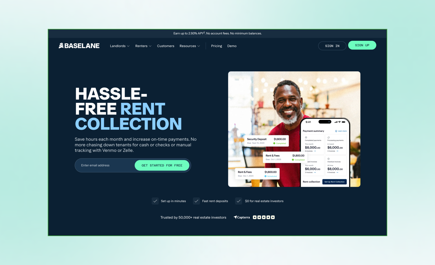 Baselane is a great choice for cost-conscious landlords, offering features such as unlimited ACH payments, integrated banking designed specifically for rental property, automated expense tracking, and more at minimal fees.