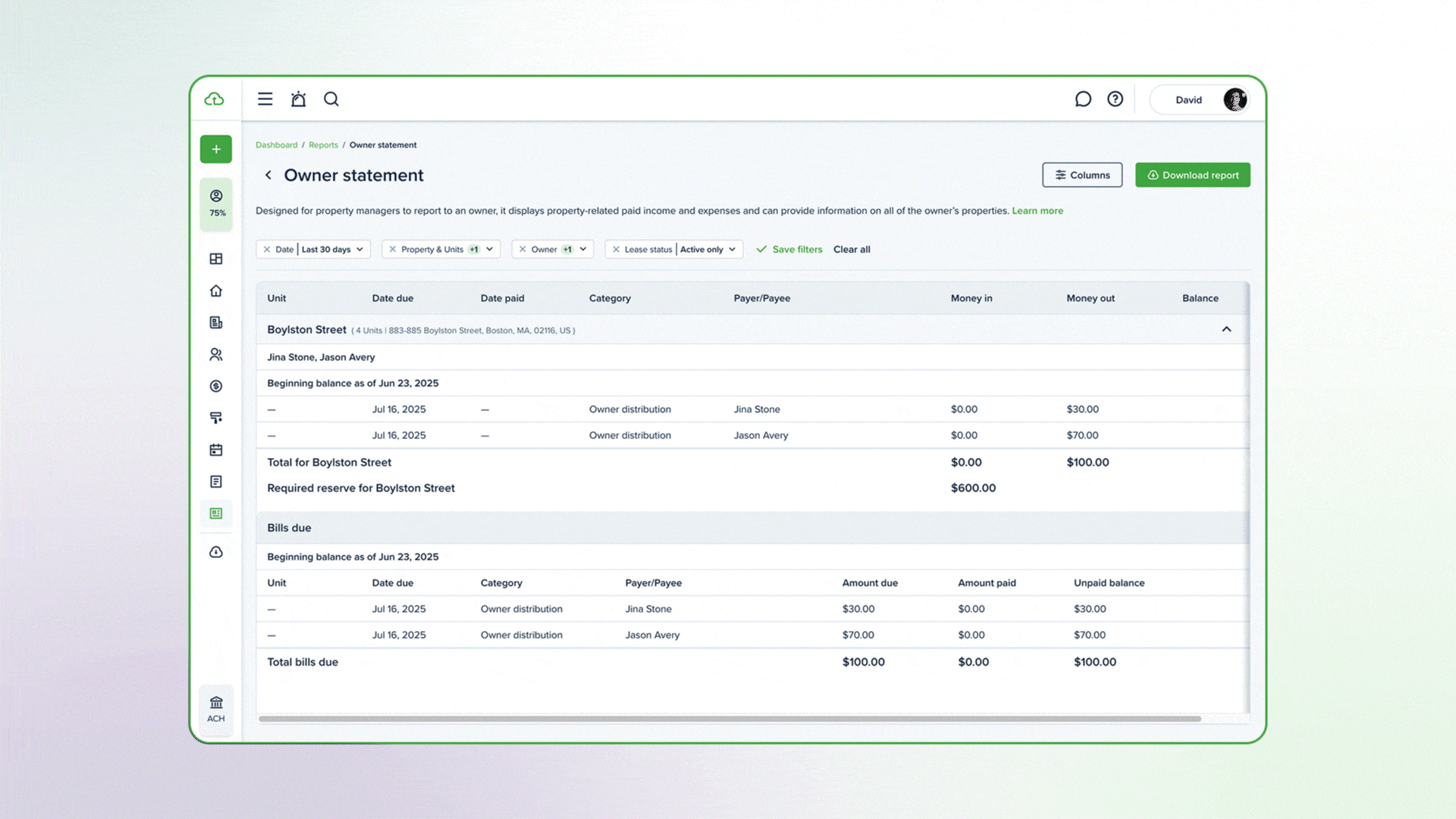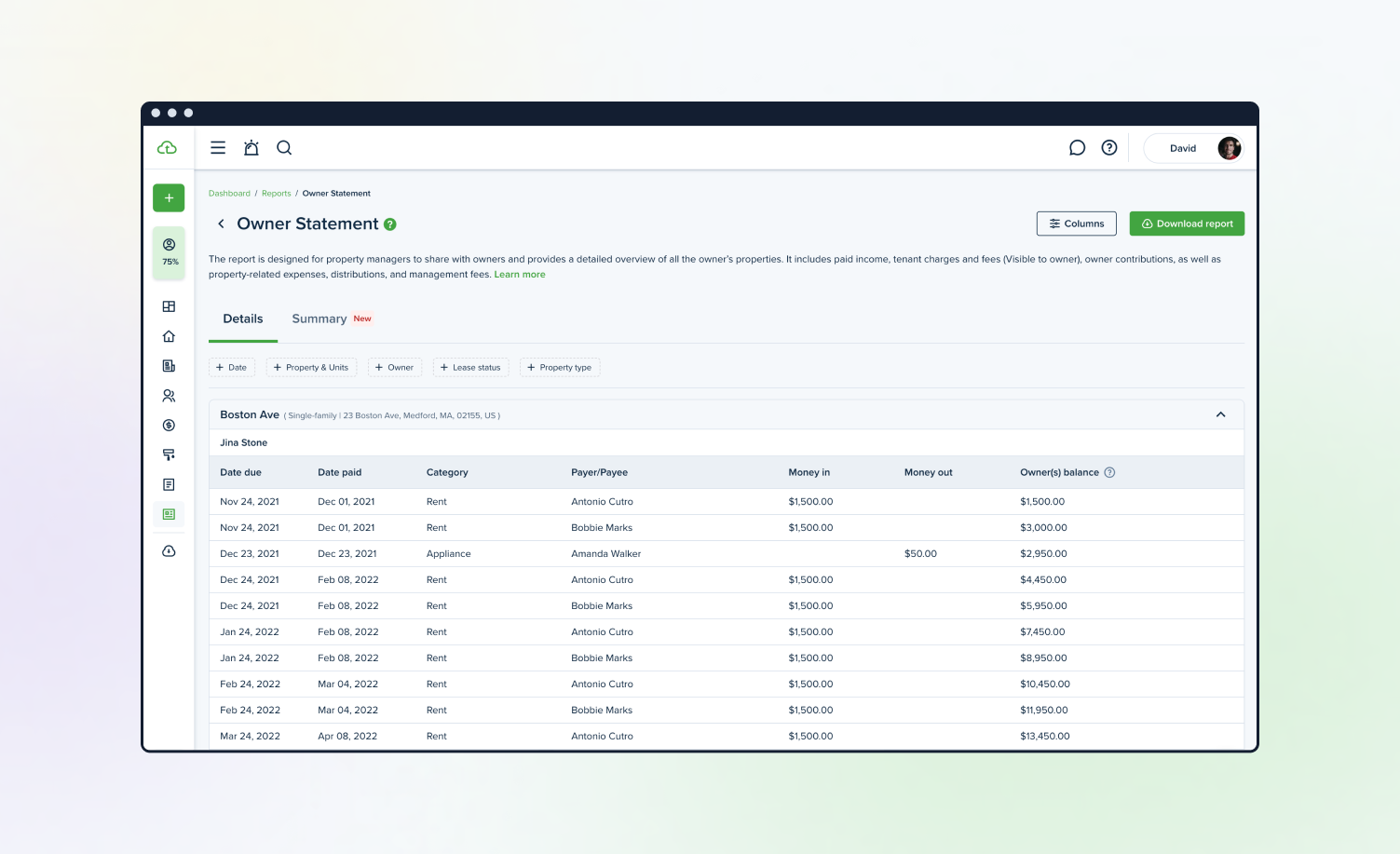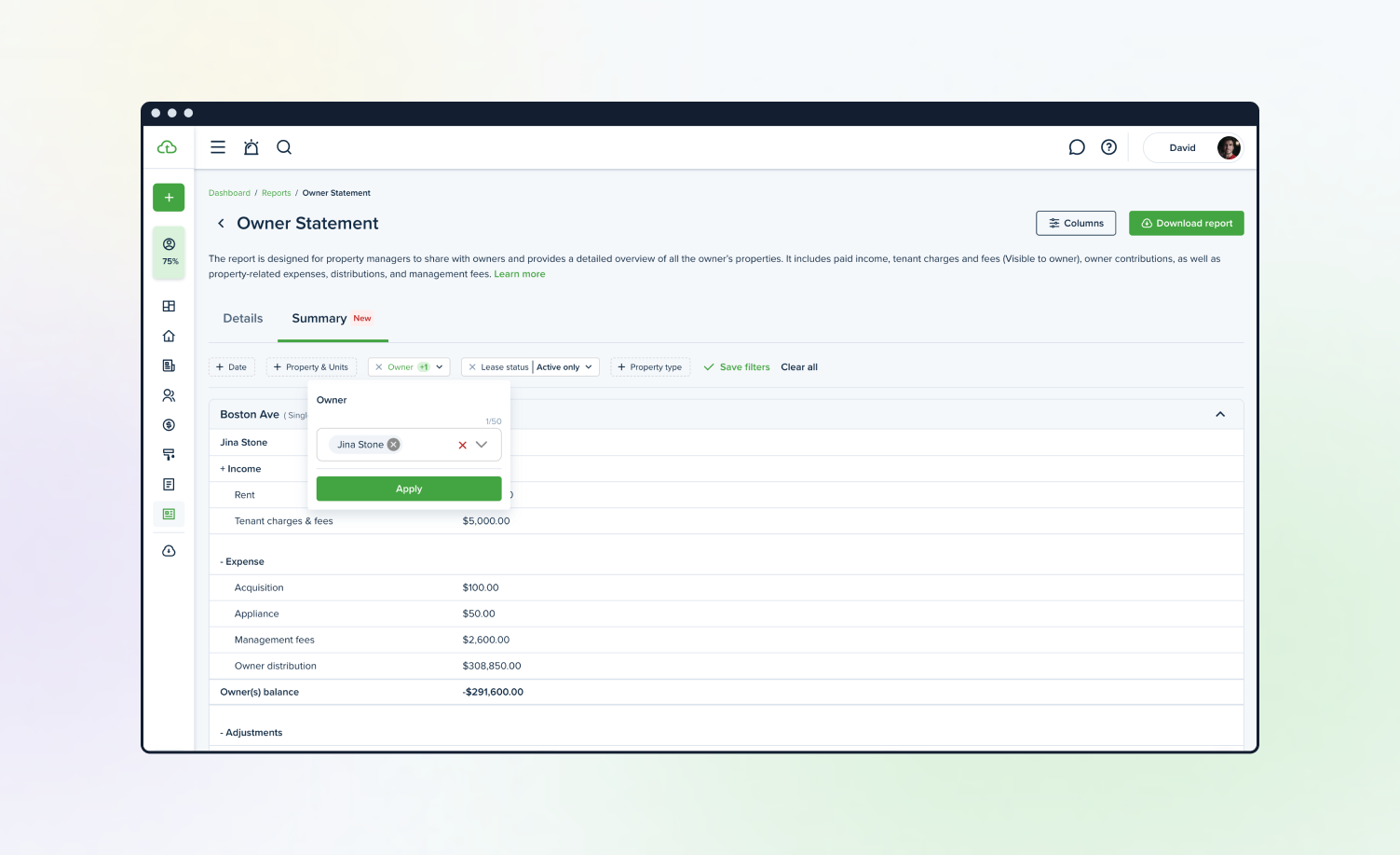 - Custom reporting – Generate statements for one property or your entire portfolio over any date range.