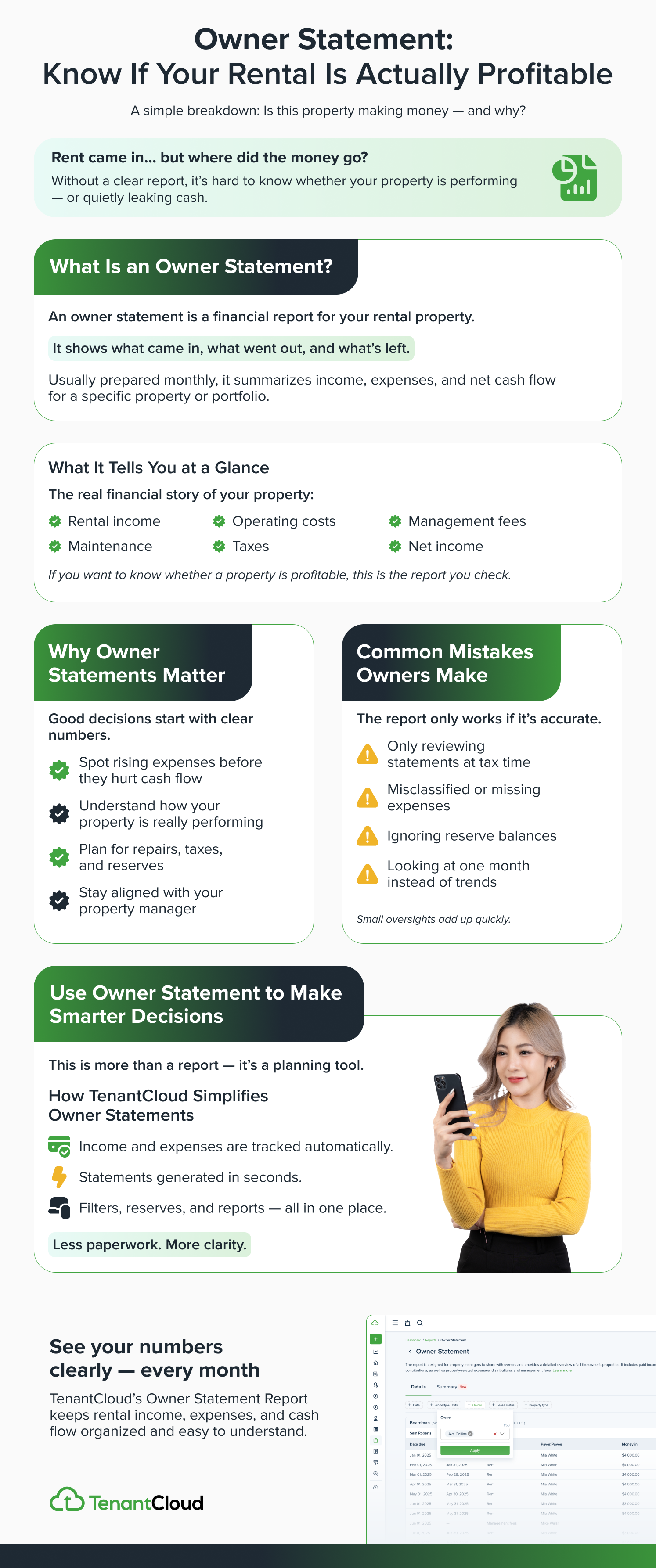 In this guide, you’ll learn what an owner statement is, how to read it with confidence, avoid common pitfalls, and use tools like TenantCloud to simplify the process.