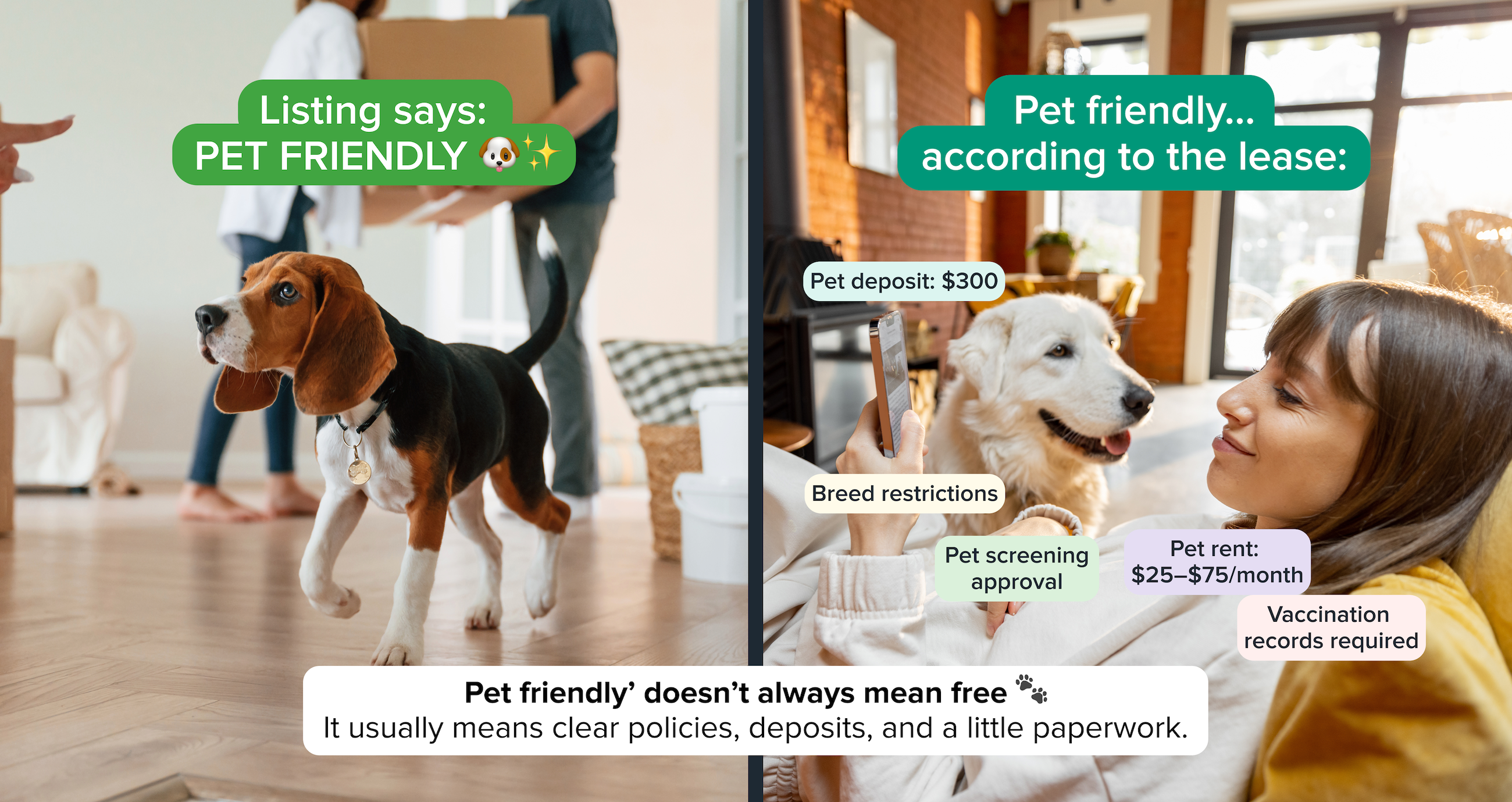 • Expect pet deposits, monthly pet rent ($25–$75 per pet), potential specialist insurance, and additional screening requirements.